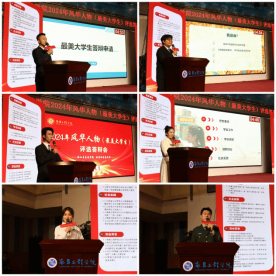 经过个人申报、学院推荐、资格审查、事迹评选等环节,共有35名优秀学子脱颖而出,入围学校答辩环节。答辩现场,同学们通过汇报演讲、视频展播等多种形式,讲述了他们的突出成绩和奋进故事,他们中有投笔从戎为祖国奉献的退伍士兵,有躬身实践扎根基层的最美志愿者,有潜心钻研攻坚克难的创新典型,也有追求工匠精神勇于科技创新的探索先锋.......一位位南工学子的优秀事迹真实生动、催人奋进,他们在服务社会中践行初心使命、在创新创业中贡献强国力量、在筑梦科研中点亮学术之光、在赛事舞台上诠释青春热爱。现场氛围热烈、精彩纷呈,现场观众被候选人的精彩表现和青春热情所感染,赢得阵阵掌声。