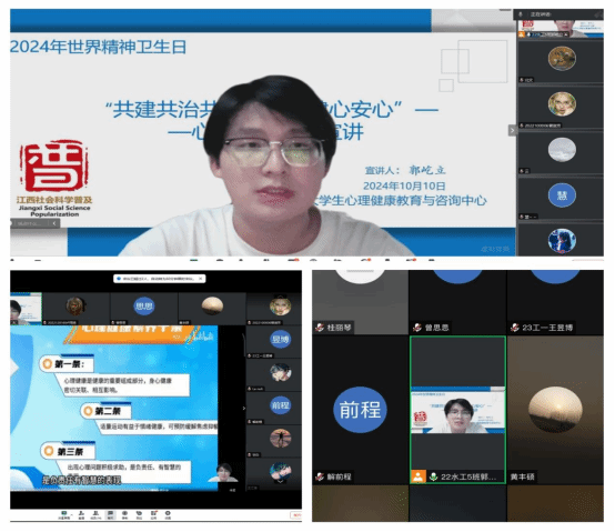 此外,心理中心开展了线上心理健康知识宣讲,通过问题导入引发学生对自身心理健康状况思考,接着为学生一一科普大学生心理健康标准、大学生常见心理健康问题,并分享“SWTC"情绪调节、正念冥想等心理技术,引导学生保持积极乐观心态。