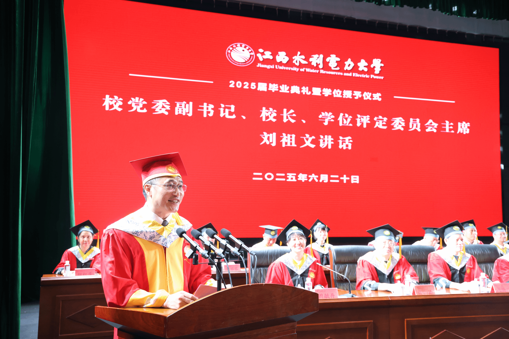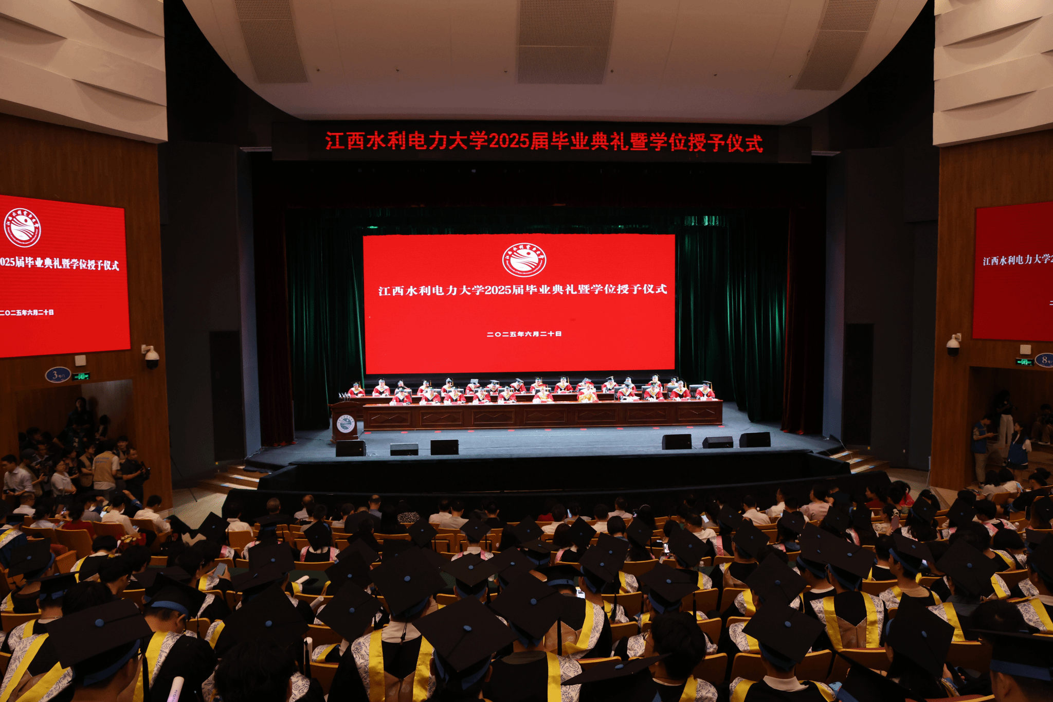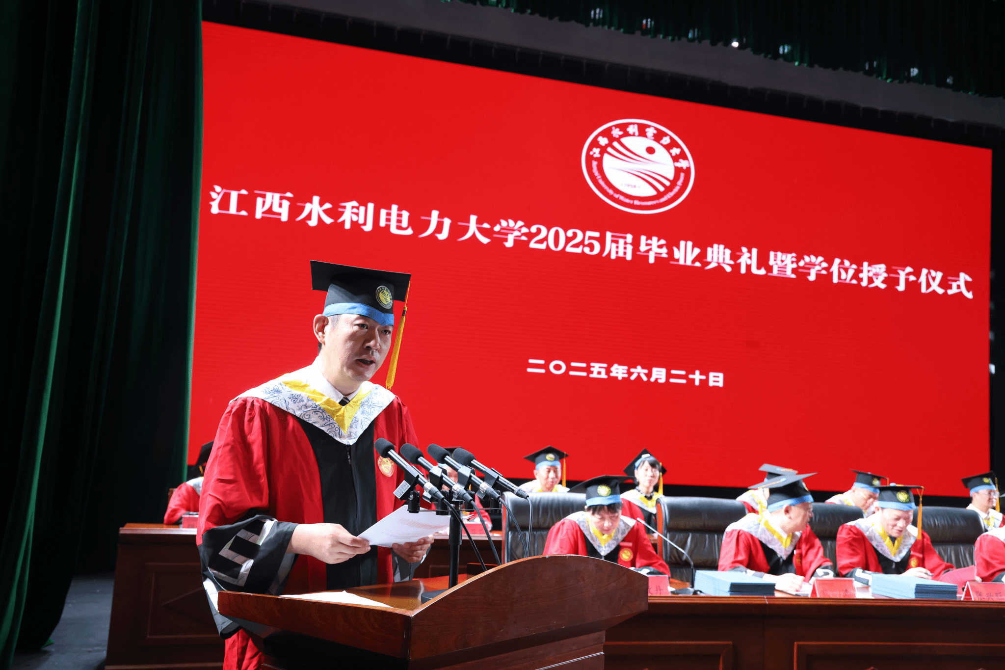 6月20日上午,江西水利电力大学2025届毕业典礼暨学位授予仪式在瑶湖艺术中心隆重举行。校党委书记汪胜前,校长刘祖文等在家校领导出席典礼,学校学位评定委员会委员,相关职能部门负责人,各学院党委和行政负责人,辅导员、班主任和家长代表及硕士、本科毕业生代表等参加。副校长周敏丹主持典礼。