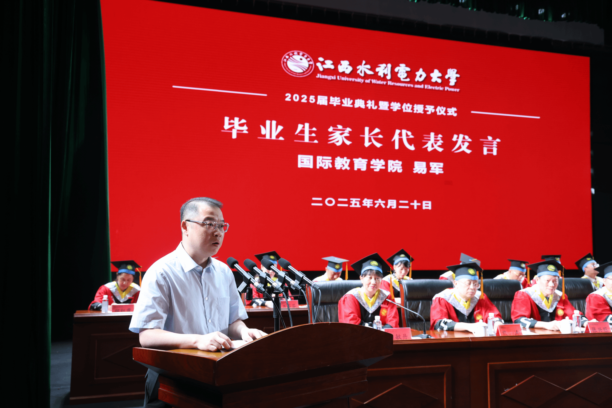 家长代表、江西水利电力大学国际教育学院2021级土木工程(中荷合作)专业易子焜父亲易军结合孩子在学校的成长,盛赞学校“以人格塑造启航梦想,用严谨治学涵养情怀”,向学校和教师致谢。
