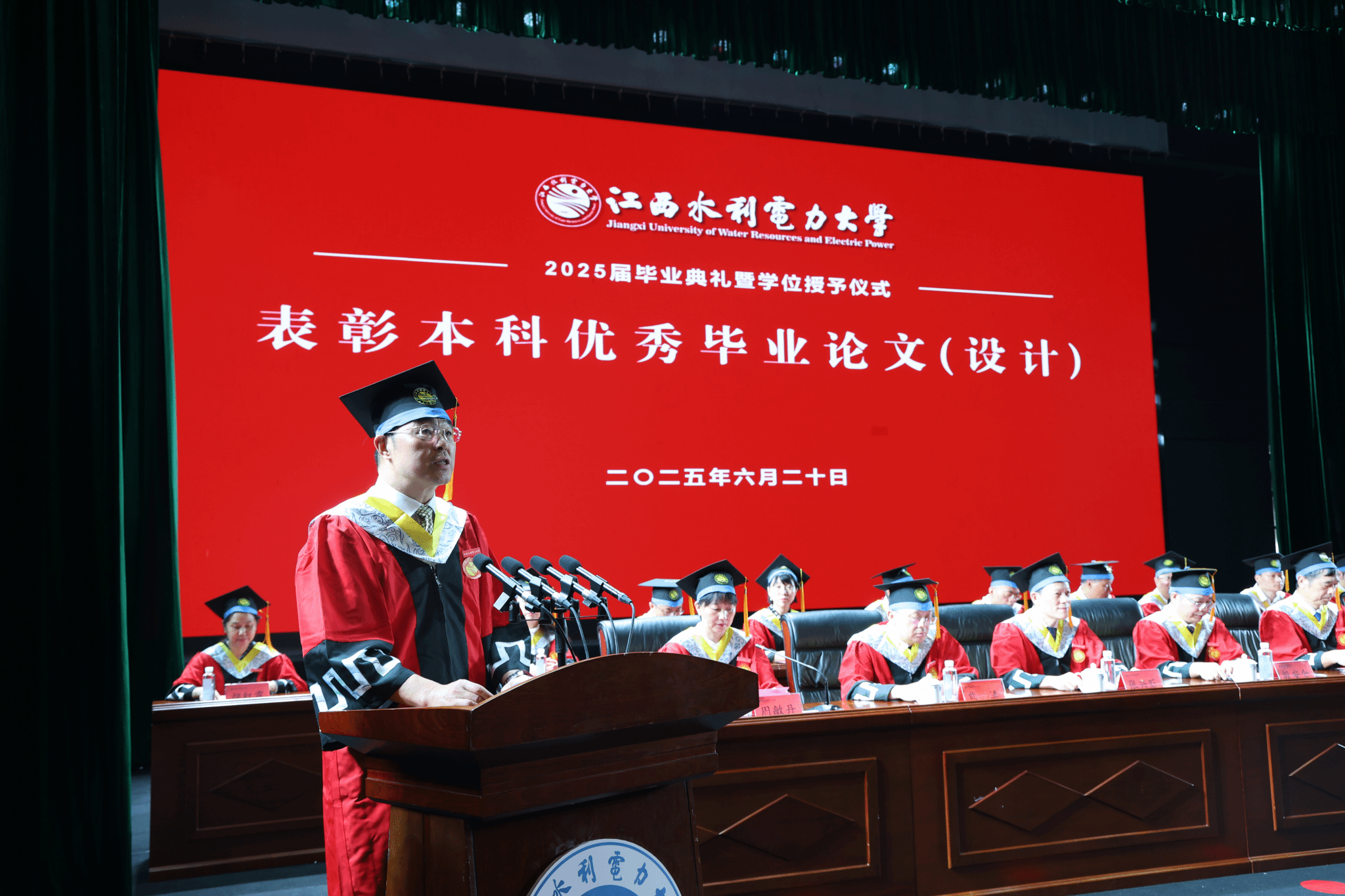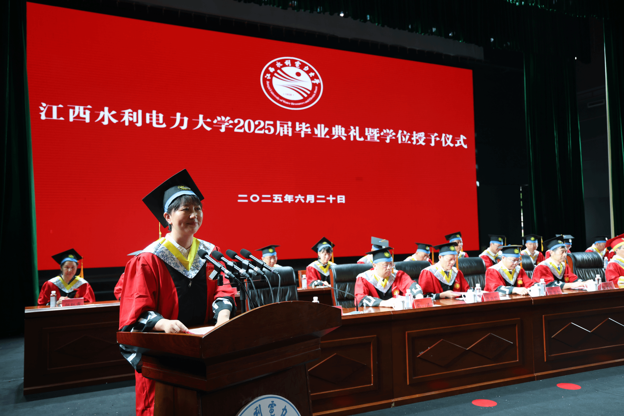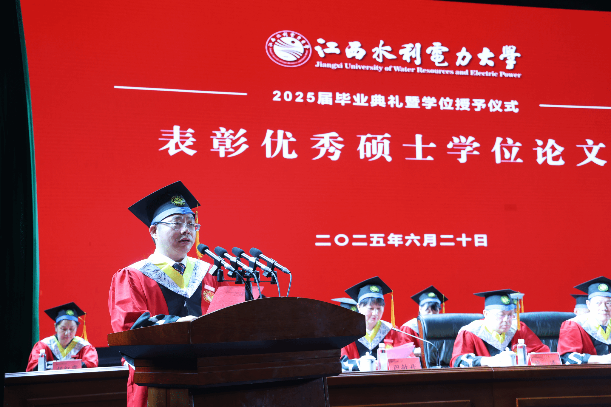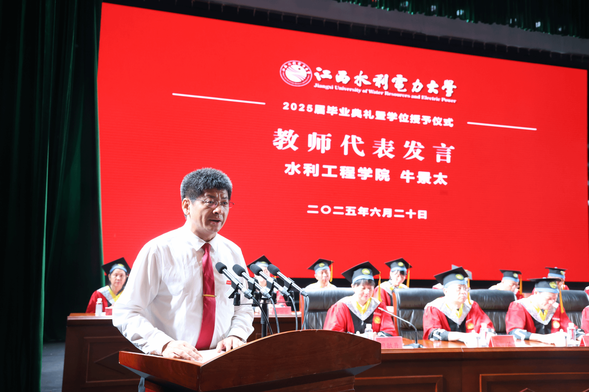 江西水利电力大学教师代表牛景太教授作发言,希望全体毕业生争做有心人,常干困难事,能立大格局,在时代浪潮中找准定位,为民族复兴伟业添砖加瓦!