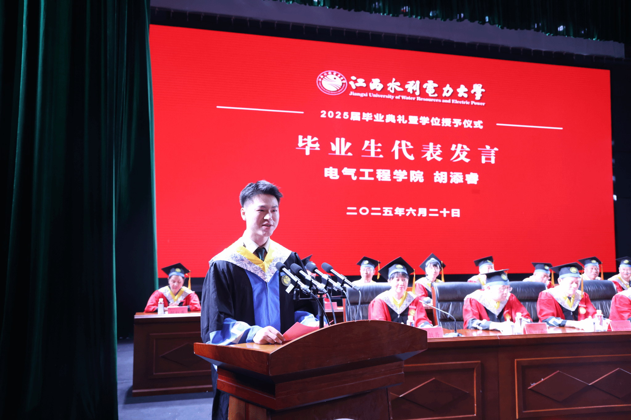 江西水利电力大学本科生代表、2021级能源与动力工程专业胡添睿结合军旅与求学经历,感谢师长以匠心点亮求知星火,并分享了自己即将前往中南大学深造的喜讯,立志“把论文写在祖国大地上”。