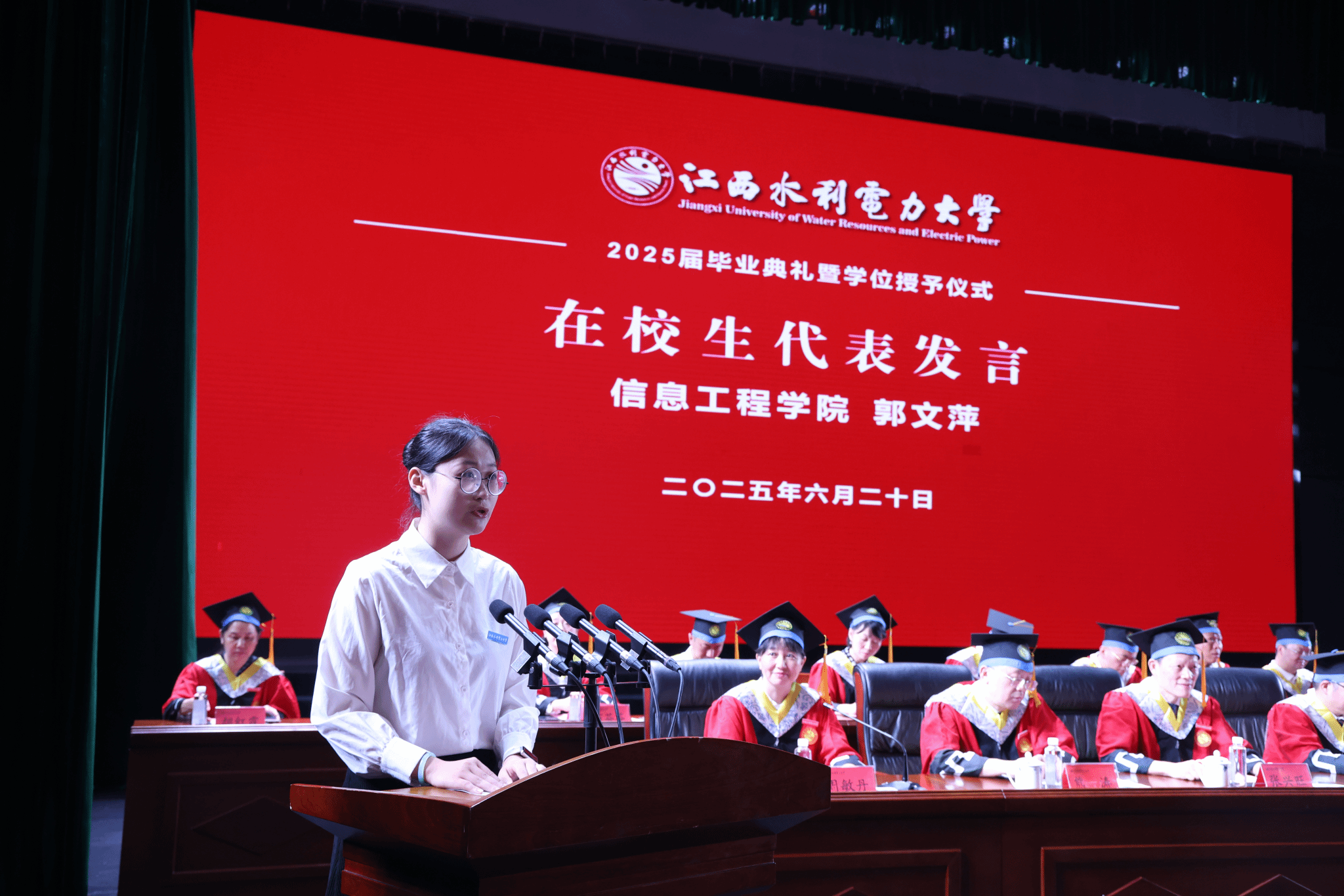 江西水利电力大学在校生代表、2022级计算机科学与技术专业郭文萍向即将扬帆远航的学长学姐致以热烈的祝贺,表示将接续奋斗,在未来的征途中书写属于自己的青春华章!