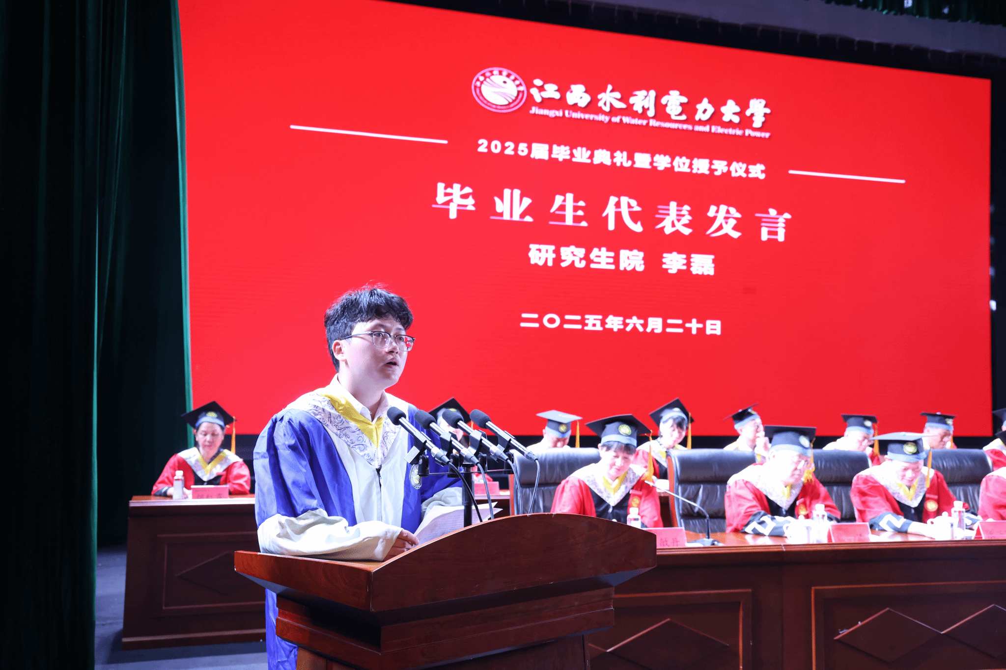 江西水利电力大学研究生代表、2022级水利工程专业李磊回顾三年科研求索之路,表达了深深的感激、不舍之情,表示将“自强不息、格物致知”的校训内化为治学精神,踔厉奋发、勇毅前行。