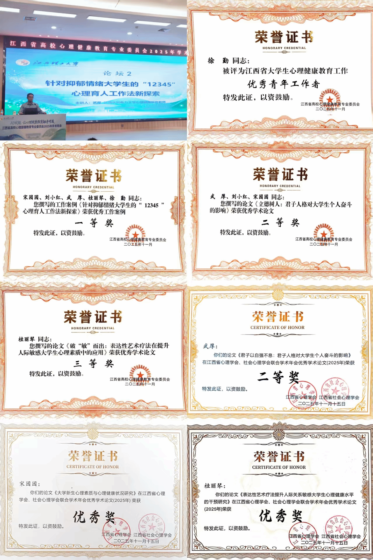 11月20日至21日,江西省高校心理健康教育专业委员会2025年学术年会在江西理工大学三江校区召开。会上,武厚老师作题为《针对抑郁情绪大学生的“12345”心理育人工作法新探索》的现场报告,该案例荣获优秀工作案例一等奖。此外,徐勤老师获评“江西省大学生心理健康教育工作优秀青年工作者”;武厚、桂丽琴老师的论文分获二、三等奖。
