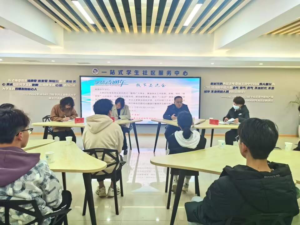 3月29日下午,我校学情直通车线下师生交流会在“一站式”学生社区服务大厅召开,副校长周敏丹、学生工作部(处)相关人员与四十多名学生参加活动。