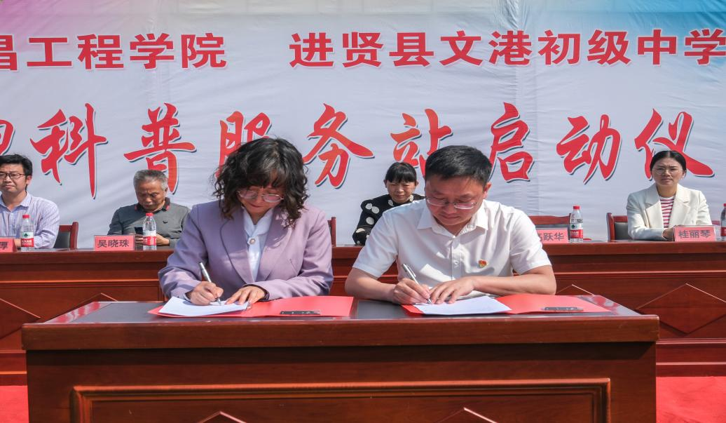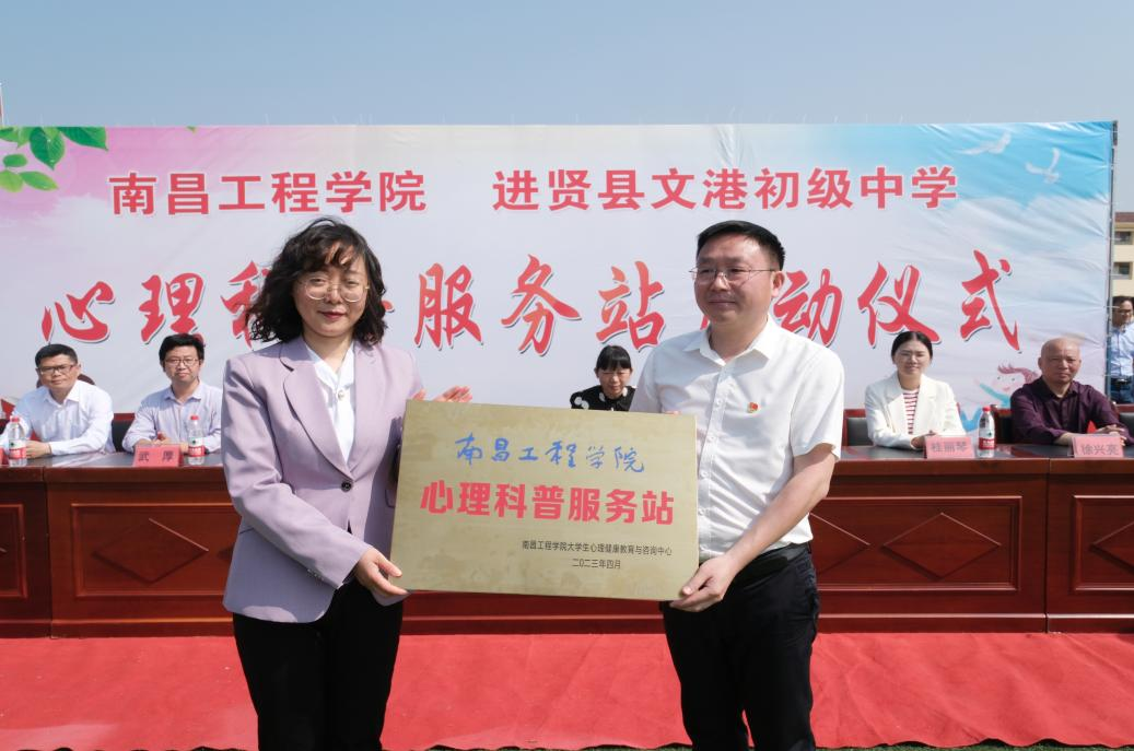 仪式上,进贤县教体局领导吴小珠致辞,对心理科普服务站的启动表示热烈祝贺。希望两校保持密切联系,加强深度合作,把学生心理健康教育工作抓出实效、做出成果。我校心理中心负责人介绍了我校面向社会开展的心理科普的相关工作,希望借此次共建心理科普服务站的机会,为青少年身心发展营造和谐健康氛围,促进未成年人身心健康,充分发挥我校两个科普基地服务社会功能。文港初级中学党支部书记兼校长高跃华表示将借用好高校心理科普服务站这一平台,不断提高协同育人质量,进一步增强中学生心理素质。随后我校和进贤县文港初级中学共同签署《南昌工程学院·进贤县文港初级中学心理科普服务站协议书》并授牌,心理科普服务站正式成立。