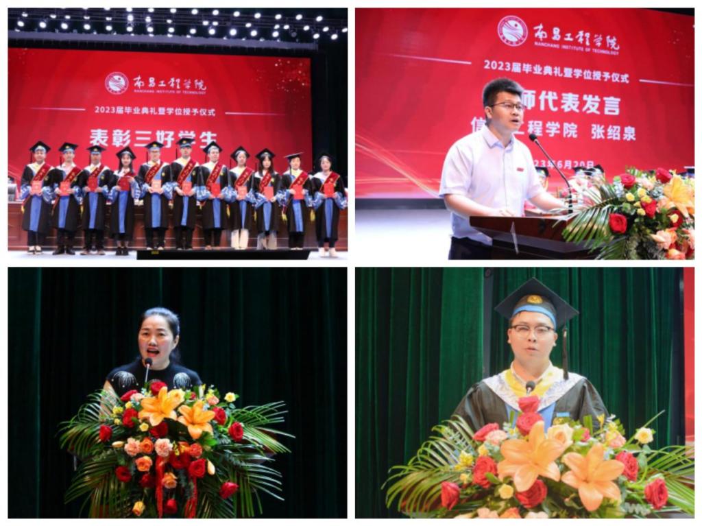 教师代表、信息工程学院教师兼校团委副书记张绍泉博士作发言,他希望全体毕业生传承“自强不息,格物致知”精神,终身学习,成就美好未来。树立“民族复兴,强国有我”志向,接续奋进,书写精彩篇章。坚持“守正创新,笃行致远”信念,开拓进取,贡献青春力量。家长代表、水利与生态工程学院2019级水利水电工程05班赖哲坤同学的母亲刘丽娥同志发言,她从孩子的成长经历出发,表达了对学校、对老师的感谢和祝福,希望远行的学子们,踔厉奋发,勇毅前行,时刻保持着进步,在生命中新的港湾继续启航!载着对未来的畅想,披荆斩棘,乘风破浪!毕业生代表、国际教育学院2019级电气工程及其自动化03班郭煜洲同学发言,他深情地表达了对母校、老师和同窗们的深情眷恋和感恩之情,将南工四年的求学经历喻为了矢志砥砺前行、勇毅追逐梦想、怀揣家国情怀的青春篇,倡议广大毕业生要义不容辞地接过时代的接力棒,展示南工学子的责任与担当!