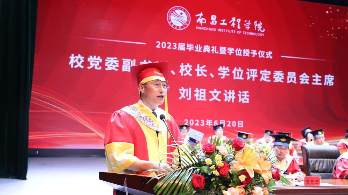 典礼在庄严的国歌声中拉开序幕。校党委副书记、校长刘祖文代表学校致辞,向顺利完成本科学业的同学们表示热烈祝贺,向辛勤培育同学们的父母和老师致以衷心的感谢。在讲话中,他深情地寄语全体毕业生:一是要以坚定理想照亮新征程上青春之路,以青年之梦想、青春之奋斗、青春之活力,勇做走在时代前列的奋进者、开拓者和奉献者。二是要以敢于担当点燃新征程上青春之火。始终以“敢”字当头,切实把责任扛在肩头,以“道在迩而求诸远,事在易而求之难”的担当精神,在攻坚克难中锻炼骨气、在自信自强中坚定底气。三是要以吃苦耐劳走好新征程上青春之旅。要学会“自找苦吃”,在学习实践中明辨是非,领悟道理,在各自的岗位上敢于挑起最重的担子、啃下最硬的骨头、涉足最险的滩涂。四是要以接续奋斗唱响新征程上青春之歌,寄语同学们秉承“自强不息、格物致知”的校训,永葆奋进姿态、永远追求卓越,在知行合一中实现思有方、谋有据、做有成,在开拓人生、奉献社会的进程中绽放绚丽之花。