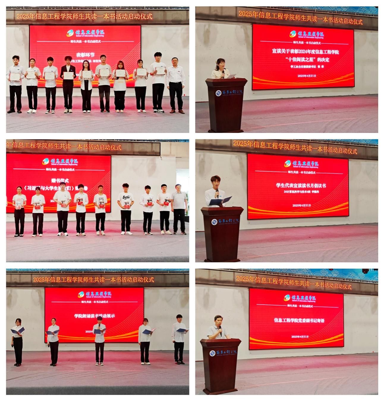 启动仪式以“世界读书日三重奏”读书活动体系为核心展开,系统解读了读书活动方案,为2024年度信息工程学院“十佳阅读之星”进行了颁奖,为各班级学生代表赠上《习近平与大学生朋友们》第二卷。2024级计算机科学与技术专业李懿玮宣读读书月倡议书。同学们接力朗诵了《习近平与大学生朋友们》第二卷相关内容。