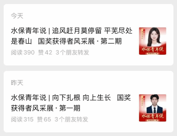 为持续深化优良学风建设,充分发挥优秀学生的榜样示范作用,营造勤奋笃学、求真创新的浓厚学习氛围,水土保持学院依托官方微信公众号(“水保团子”)宣传平台,聚焦国家奖学金获得者、最美大学生等先进典型,组织开展“水保青年说”线上学风沙龙活动,展现水保学子风采、传递青春正能量。