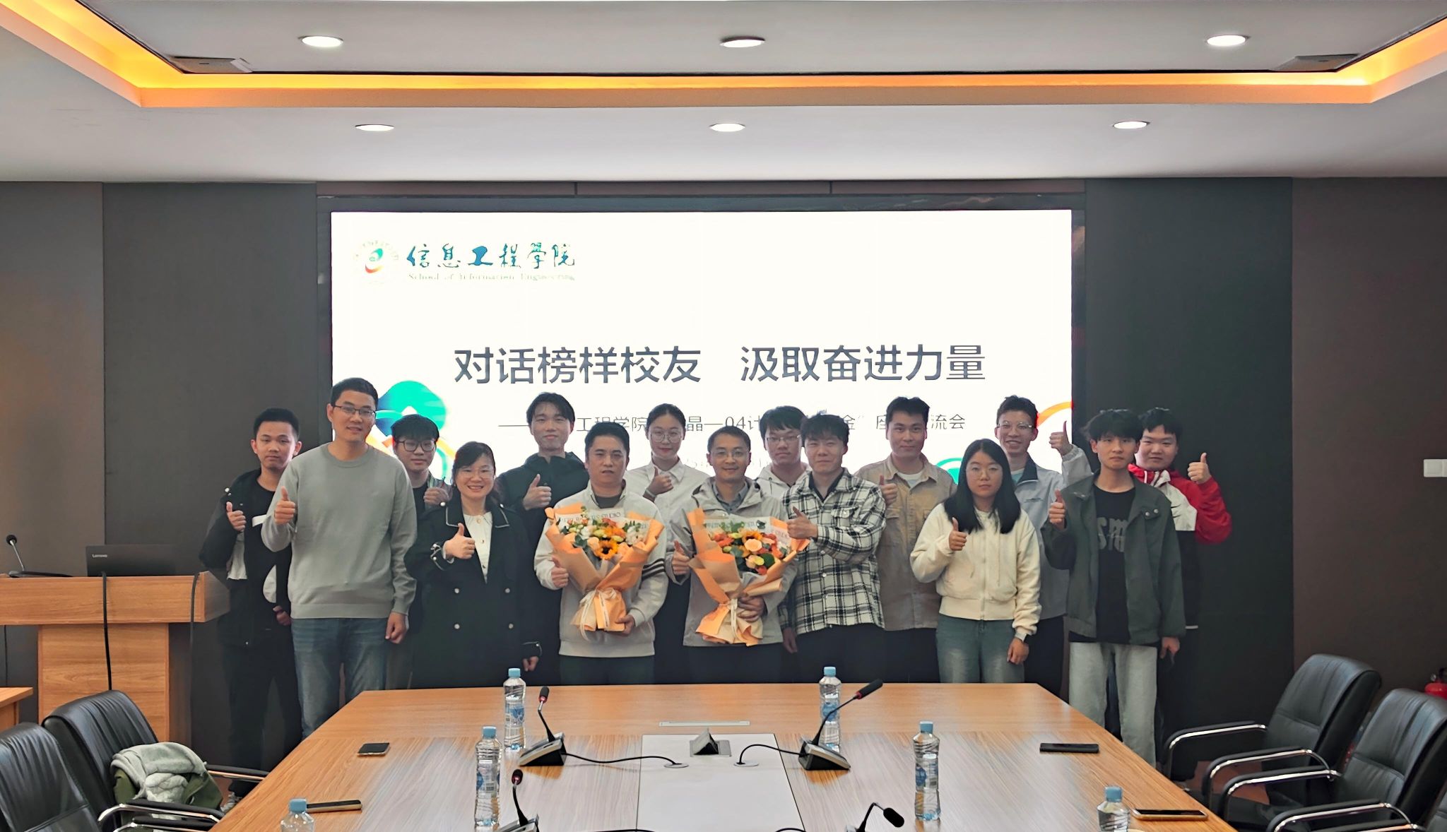 座谈会的最后,获奖学生代表向两位校友献花,表达诚挚谢意并合影留念。座谈会在“为校争光 激发天赋”的殷切寄语中圆满结束,信工学子不懈探索的精神力量、蓬勃向上的青春风采,以及薪火相传的感恩情怀,仍将在未来持续延续、熠熠生辉。(文/张荣 林浩天 图/朱世媛 )