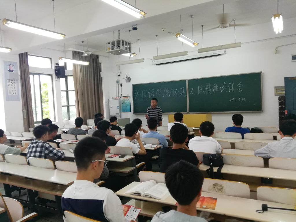 为鼓励同学们积极应征入伍,推进国防和军队现代化军队建设,19年5月13日下午一点,外国语学院在教学南大楼B312组织开展征兵工作精准座谈会。本次座谈会由外国语学院党总支书记朱代洪主讲,外国语学院部分男生参与听取本次会议。