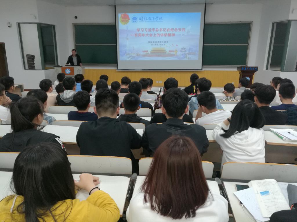 为引导青年团员认真学习习近平总书记重要讲话精神,把思想和行动统一到党中央对青年成长成才的新要求新部署上来。5月8日晚,国际教育学院分团委组织团员在南C104教室集中学习《习近平在纪念五四运动100周年大会上的讲话》,全体大一团员近200人参加了学习活动,分团委书记戴国星介绍了讲话精神。