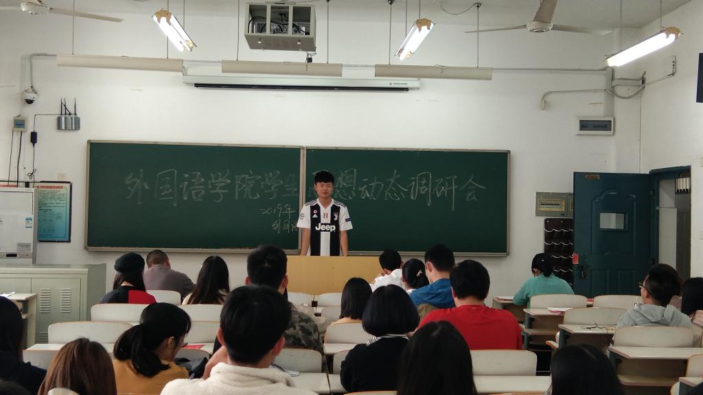 为全面深入了解同学们的思想动态,切实增强思想政治理论教学的效果,外国语学院于2019年5月8日中午12点50分在南B312组织开展了学生思想动态调研会。出席此次会议的有外国语学院党总支书记朱代洪、分团委书记王聪、辅导员赖晓琴、肖芬,全院所有班级班长、团支书和学习委员参与本次讲座。