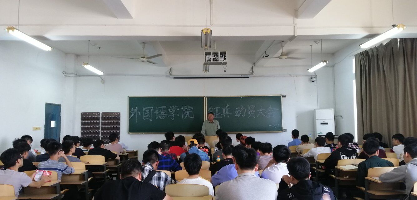 为进一步加强学生的国防意识,调动同学们参军入伍的积极性,19 年 5 月9 日中午,外国语学院在教学南大楼 B315 组织开展征兵动员大会。参与本次动员大会的领导嘉宾有外国语学院党总支书记朱代洪、外国语学院分团委书记王聪、辅导员赖晓琴,全体外国语学院男生参会。