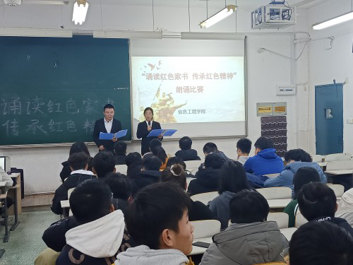 为传承红色经典,弘扬红色精神,重温老一辈知识分子的家国情怀和奉献精神。信息工程学院于12月8日在南B104举办“诵读红色家书,传承红色精神”诵读比赛。各班级入党积极分子近百人参加了此次活动。