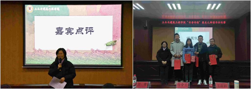 为弘扬中华传统文化,引导学生亲近中华经典,培育爱国主义情怀,12月14日,由土木与建筑工程学院特色学生工作基地国学苑主办的“书香诗韵”最美元曲读书会大赛决赛在大学生活动中心B100成功举办,经过初赛与复赛的激烈角逐,最后6支队伍进入了决赛。党委宣传部思政科副科长徐金兰、辅导员万珊、王嘉颖、黄萍老师莅临指导,部分学生到场观看。