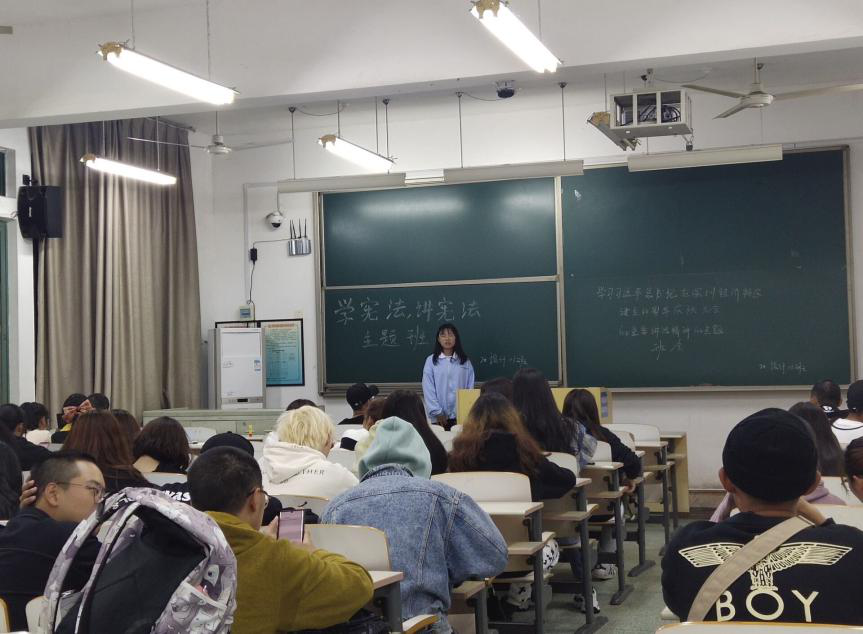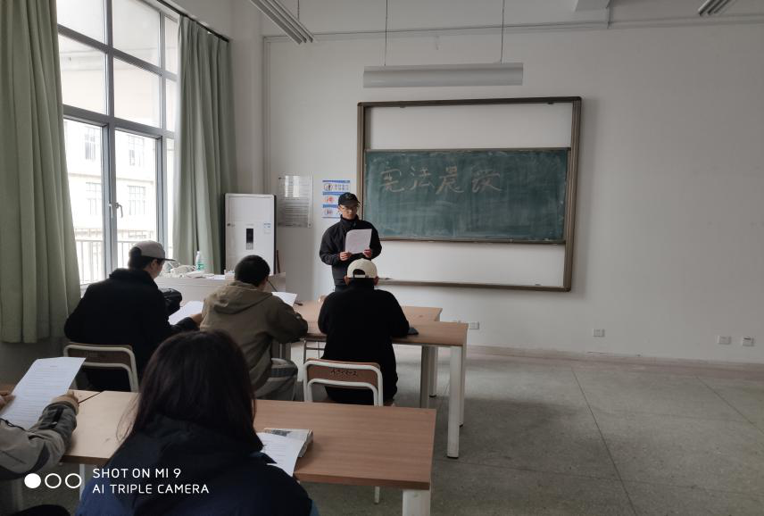 9月25日起,由学生骨干组织,各班班主任和班长带领各班同学分批召开“学宪法,讲宪法”主题班会,进行了为期一个月的宪法学习和答题活动。12月4日早晨,学院组织学生干部带领各班学生于艺术楼教室进行“宪法晨读”活动。朗朗地读书声不绝于耳,将法律准则铭记于心。课间,同学们又围坐在一起,进行了关于宪法的深层讨论。在对于宪法有了进一步的了解后,同学们纷纷表示认识到了宪法宣传的必要性及宪法学习的重要性。同日上午9点,各班班长组织部分学生通过教育部全国青少年普法网收看网络直播,结合早晨的“宪法晨读”活动带领同学们更加深入地学习宣传习近平法治思想,大力弘扬宪法精神。