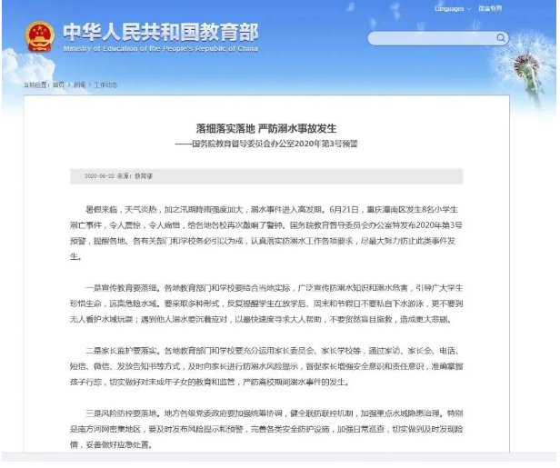 第3号预警要求,各地、各有关部门和学校要对重庆潼南区8名学生溺亡事件引以为戒,认真落实防溺水工作各项要求,尽最大努力防止此类事件发生。