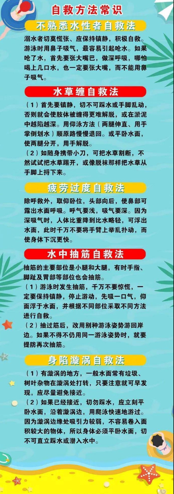6.溺水时不要慌张,发现周围有人时立即呼救。放松全身,让身体漂浮在水面上,将头部浮出水面,用脚踢水,防止体力丧失,等待救援。及时甩掉鞋子和口袋里的重物,身体下沉时,可将手掌向下压;