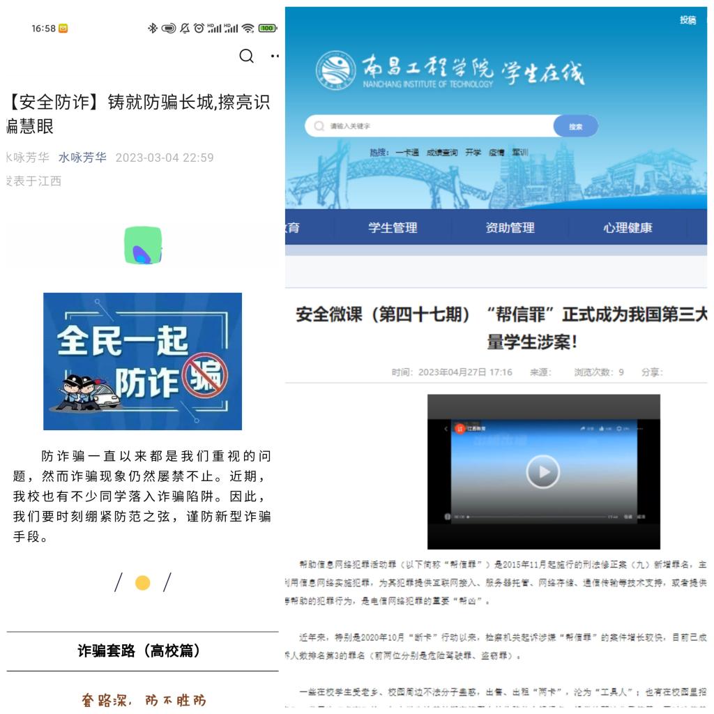 扩大宣传范围,深入学生群体。充分利用学工在线、微信群、QQ群等媒介定期送推有关防范电信网络诈骗宣传的安全微课及典型案例,在学生公寓各楼栋展板、电子屏上展示宣传片和标语,构建“线上+线下”一体化防范电信网络诈骗防网。