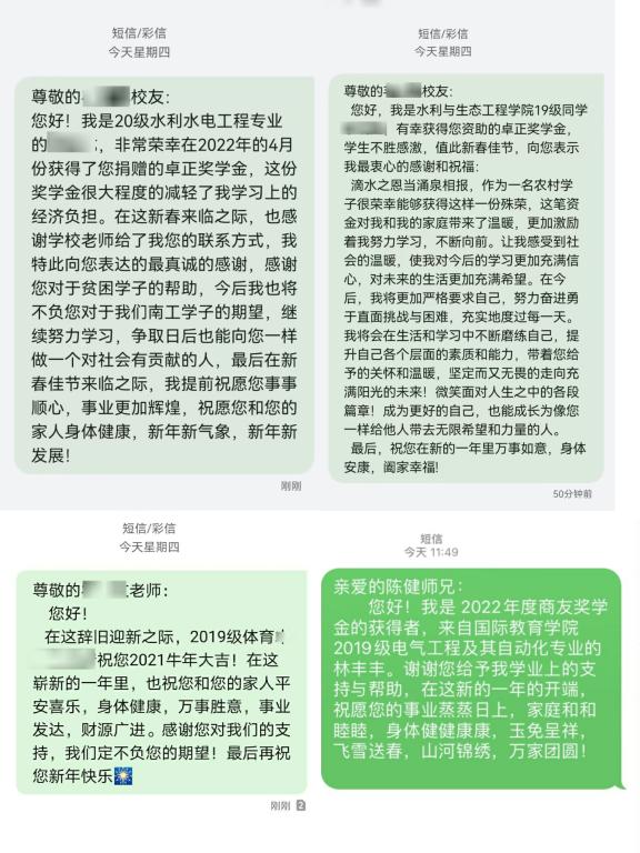 新年伊始,万象更新。在新春佳节到来之际,各学院组织受资助学生通过短信、书信方式向奖学金捐赠者送去新春祝福。