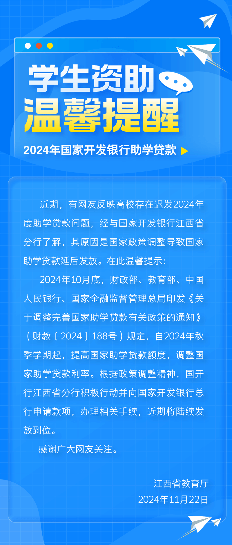 上一条:全国学生资助管理中心2025年第1号预警:警惕“助学贷款还款”骗局 下一条:关于调整完善国家助学贷款有关政策的通知