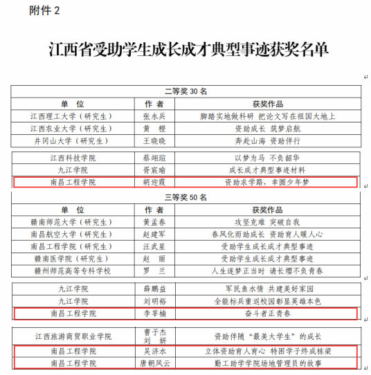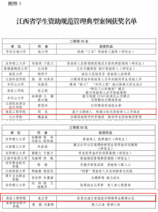 近日,省教育厅公布了江西省学生资助规范管理典型案例和受助学生成长成才典型事迹评选结果,我校在江西省学生资助规范管理典型案例中,学生资助管理中心邹岚老师荣获二等奖、袁玉雯老师荣获三等奖;在受助学生成长成才典型事迹评选活动中,外国语学院2021级翻译专业胡迎霞同学荣获二等奖,工商管理学院2020级电子商务专业李莘楠同学、机械工程学院2019级车辆工程专业吴济水同学、瑶湖学院2021级水利水电工程专业唐朝风云同学荣获三等奖。