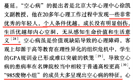 徐凯文老师讲“空心病”时提到过,很多优秀的学生上了大学,失去了父母的管控和外界规定的目标后,就容易陷入焦虑、抑郁状态——