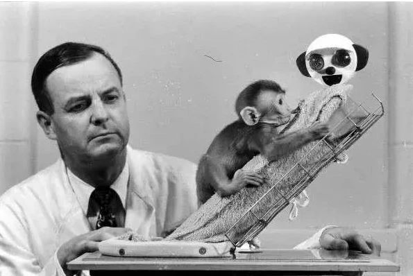 1959年,美国心理学家哈洛(Harlow)对恒河猴的研究结果,也能看出个体出于本能对和母亲接触的需要。他和同事将刚出生的幼猴同母亲分离,并用两个代理母猴替代真母猴——一个是被海绵和毛织物包裹体内安装微暖灯泡的“绒布母猴”,一个是外型基本相同但是由铁丝网制成的胸前有奶瓶的“金属母猴”。