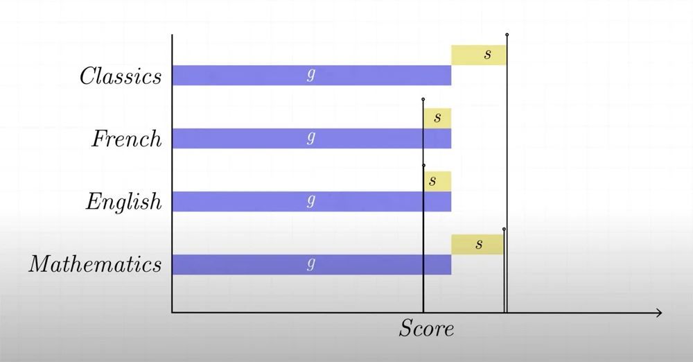 他发现,在一个科目中表现好的学生,倾向于在所有科目中都表现良好,因而提出,每个人都有一定程度的“G因子”,即一般智力,认为这种相对固定的智力反应了学习新知识的速度、认知模式、以及批判性思维,这也就解释了为何学生们在各个科目上的成绩会呈现出一定的关联性。
