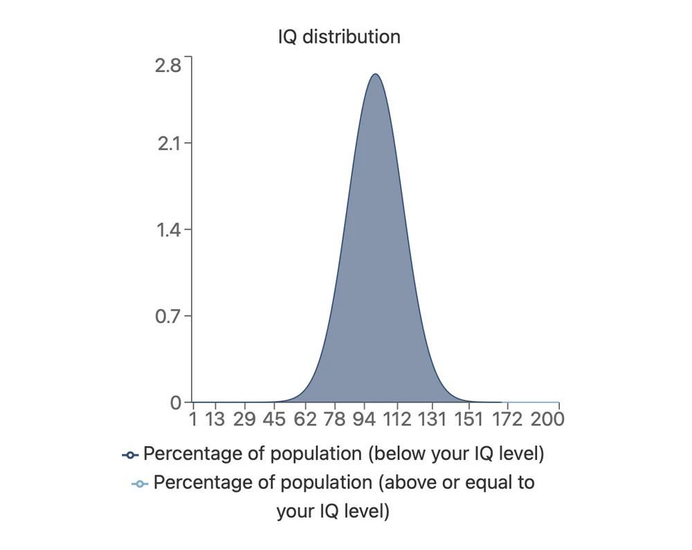 如今,IQ测试的最高分是平均值四个标准差,即160分;最低分则是40分。一旦超出这个范围,测试的准确性就会受到影响,因此那些自称190分或250分的IQ值是虚构的。