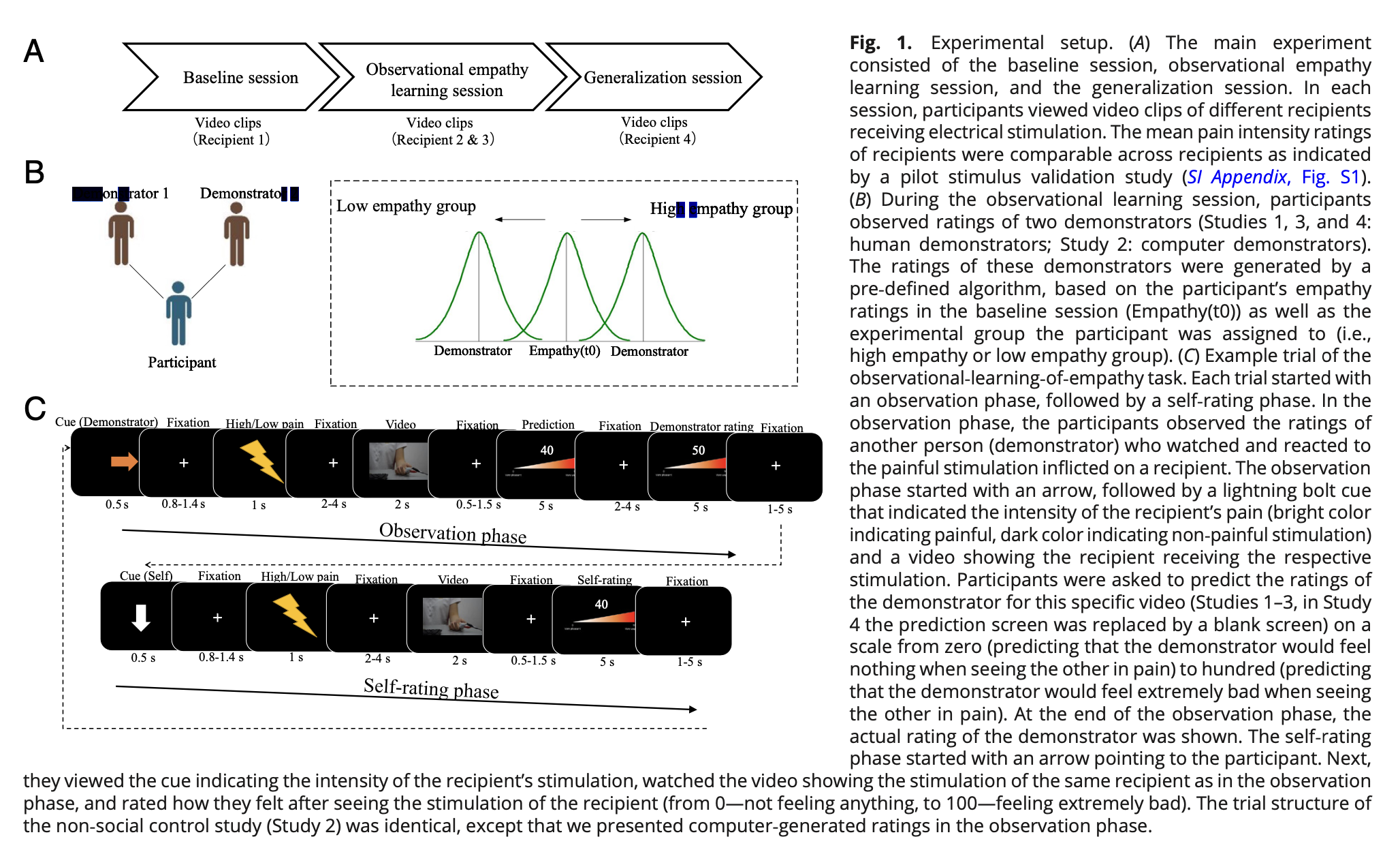 Zhou, Y., Han, S., Kang, P., Tobler, P. N., & Hein, G. (2024). The social transmission of empathy relies on observational reinforcement learning. Proceedings of the National Academy of Sciences, 121(9), e2313073121.