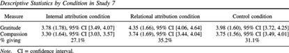 在实验6中,研究者分两个阶段(操纵前和操纵后)进行,分别测量了被试的归因基线,不同归因的变化程度,及其与同情的关系。共招募了501名成年被试。首先,要求所有被试反思他们在获得高级学位的挑战中面临的影响因素,完成复原力归因量表。然后,一半被试接受内归因操纵,另一半被试接受关系归因操纵,再测量他们对另一个也在努力完成高级学位的人的同情程度,接着再填写一遍归因量表。结果表明,大多数被试在两阶段都倾向于内部归因,而接受关系归因操纵的被试显著增加了关系归因,并且关系归因条件下的被试所报告的对他人的同情水平高于内部归因条件下的被试。