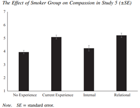 在实验5中,研究者招募了145名戒烟者、76名目前吸烟者和162名从不吸烟者。其中,戒烟者被随机分到了内部复原力归因条件和关系复原力归因条件,两种条件分别涉及让被试在5个内部和关系因素中,选择促进其戒烟的前两个因素,并详细说明这两个因素如何促成其戒烟行为。然后让每个被试阅读关于他人戒烟的小短文,并完成同情及感激的测量。