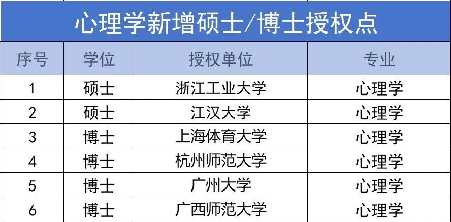 心理学新增2个硕士学位授权点,4个博士学位授权点: