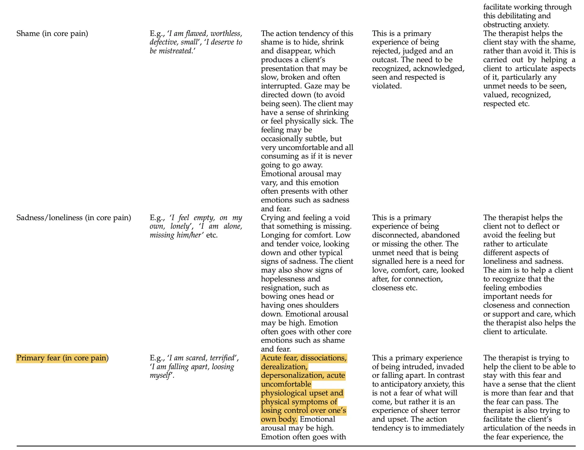 核心情绪痛苦往往是极其强烈和难以忍受的,它们可能让人感觉完全被情绪淹没。因此,来访者经常会陷入一种全面的痛苦状态,无法具体指出到底是什么情感在困扰他们。这时,更表面的情绪,比如无助感和无望感,往往会遮盖住真正的核心情绪。研究显示,抑郁、复杂创伤和焦虑中的核心情绪痛苦,主要围绕羞耻感、孤独感和恐惧感展开。虽然不同学者在表述上有所差异,但它们共同指出了情感痛苦中未被满足的需求。