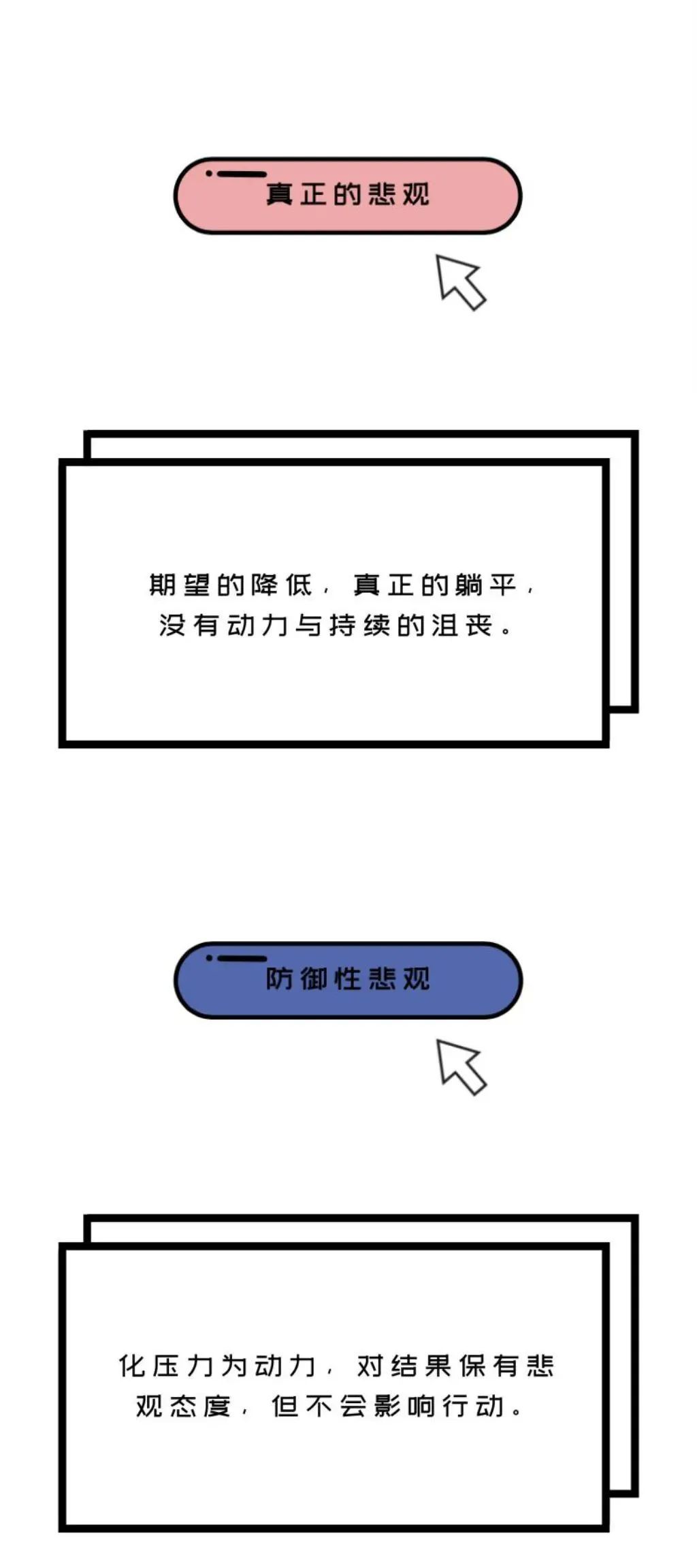 防御性悲观不同于真正的悲观,真正悲观既降低了期望水平也降低了成就,是一种适应不良的反应,而防御性悲观不会对实际的成绩产生负面作用,防御性悲观者的表现并不差,真正的悲观往往会影响成绩。