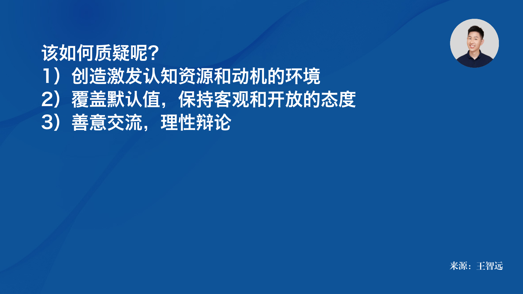 所以,该如何质疑呢?我觉得可以分为三个步骤,分别是:创造激发认知资源和动机的环境、覆盖默认值,保持客观和开放的态度、以及善意交流和理性辩论。总而言之: