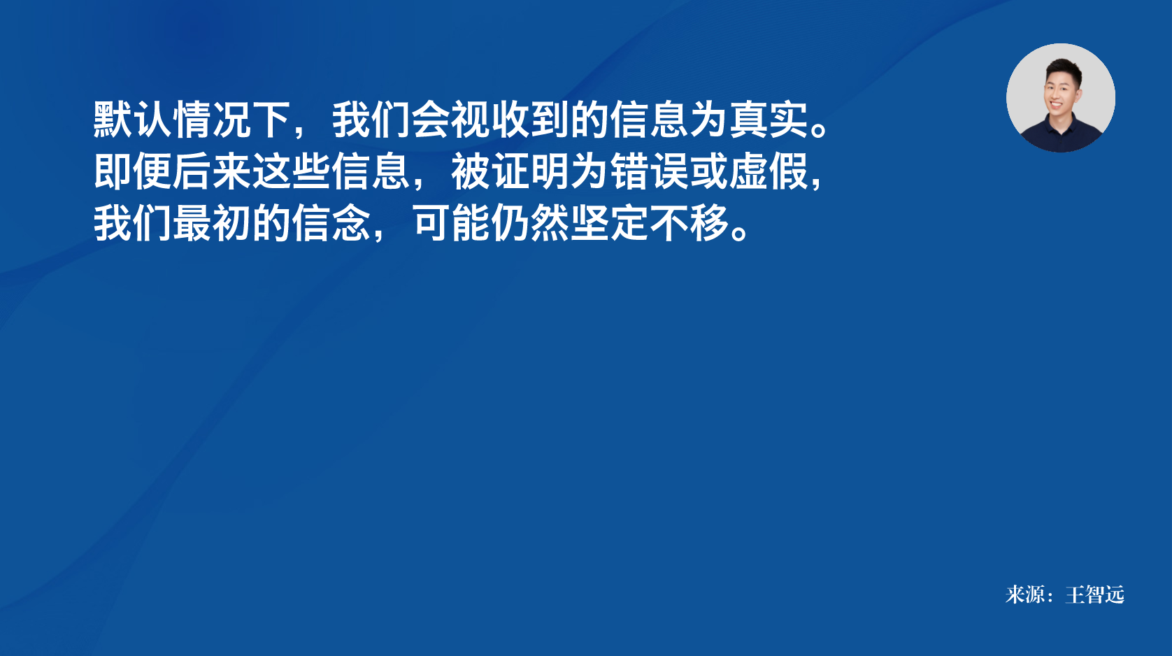 也就是,默认情况下,我们会视收到的信息为真实。即便后来这些信息,被证明为错误或虚假,我们最初的信念可能仍然坚定不移。