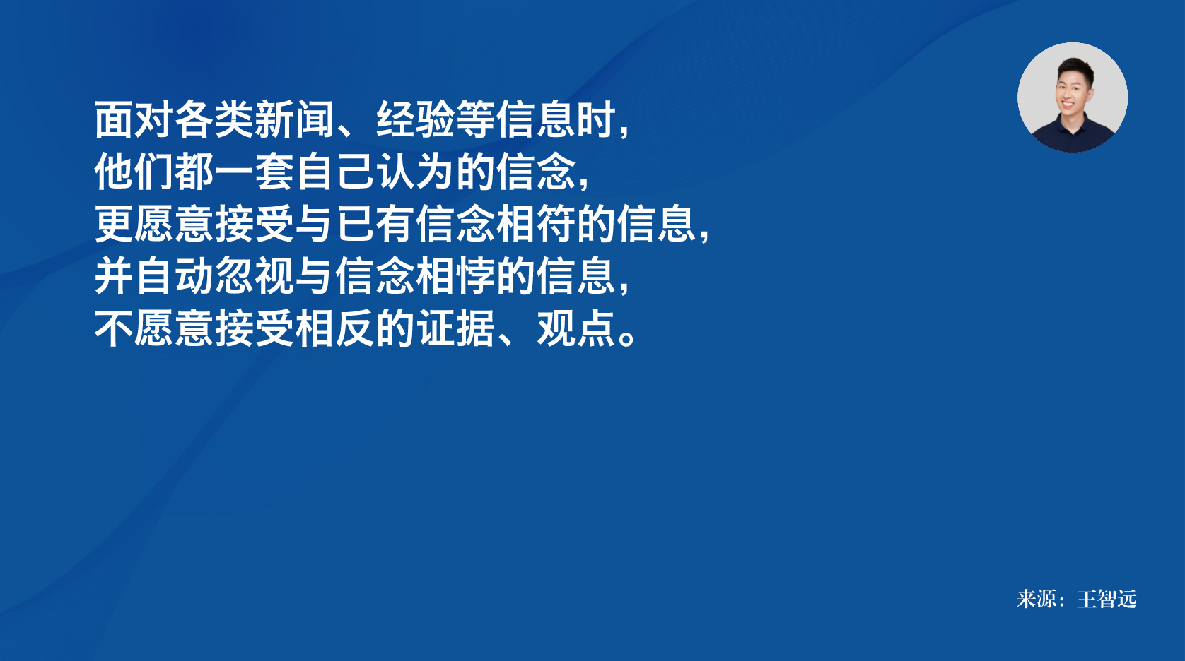 面对各类新闻、经验等信息时,他们都一套自己认为的信念,更愿意接受与已有信念相符的信息,并自动忽视与信念相悖的信息,不愿意接受相反的证据、观点。