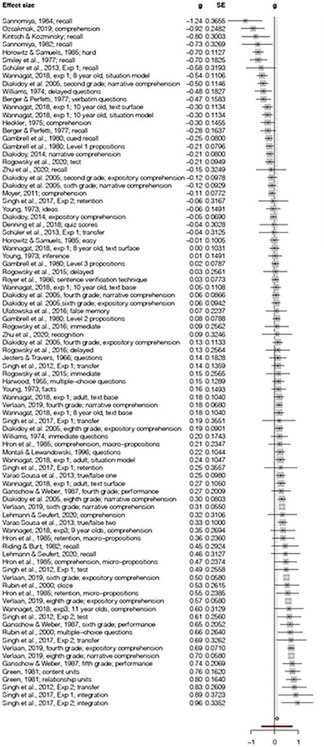如图所示,右侧每个点表示一项研究,以实线为分界,实线左侧表示看在理解中有优势,实线右侧表示听在理解中有优势。最下方横轴的菱形点表明,这两种理解方式总的来说看书略占优势,但看和听并没有显著差异 。