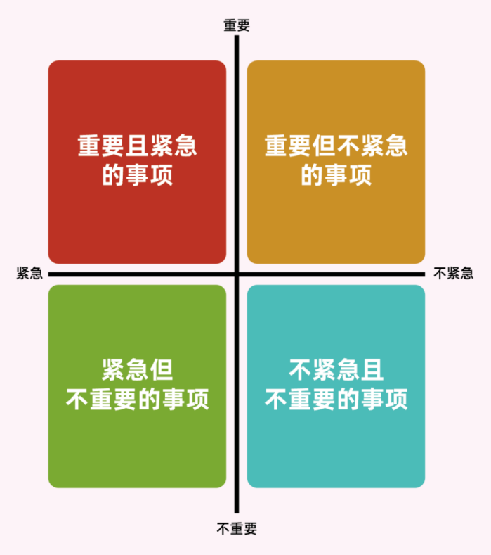 另一个是优先级管理策略,当我们感到事情繁多且细碎,我们可以借助备忘录、记事本的帮助。在纸上画下一个“重要程度”和“紧急程度”的坐标轴,将纸面分为4个部分,哪些是重要且紧急的?哪些是紧急但不重要的?将那些既不紧急也不重要的任务适当地向后分配,甚至忽略。确保首先完成最重要的任务,在有限的时间内取得最大的成就感。