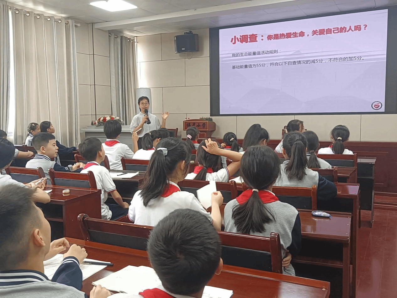 接着,宋园园老师通过带领学生进行生活小调查活动走进本次讲座的第二个板块——珍爱生命。宋老师的调查问题贴近学生的实际生活,以“我的生命能量活动”为载体,学生在加减能量值的过程中渐渐体悟到要热爱生命,关爱自己。紧接着宋园园老师又组织学生们进行“生命游戏体验”活动让学生明白了生命的价值,生命的有限性。