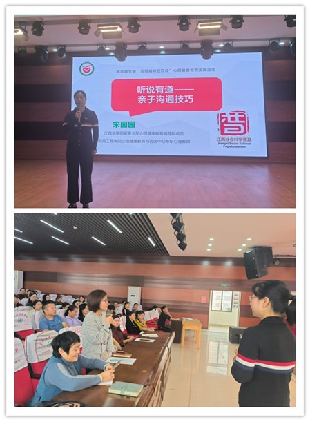 10月21日下午,大学生心理健康教育与咨询中心(江西省社会科学知识普及宣传基地、江西省科普教育基地)走进南昌县诚义学校开展校外心理科普服务。心理中心教师宋园园为南昌县诚义学校183位中学生家长带来“听说有道——亲子沟通技巧”主题讲座。