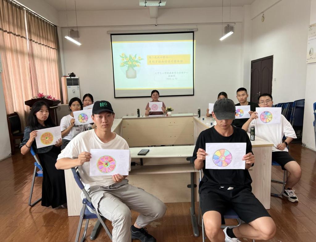 6月13日下午,我校“万师润万心”心理健康大行动“护万生”计划之“周二说说心理话”活动在大学生活动中心A410举行,专职心理教师桂丽琴带领同学们进行曼陀罗绘画情绪疗愈体验。来自各学院的多名学生参与了此次活动。