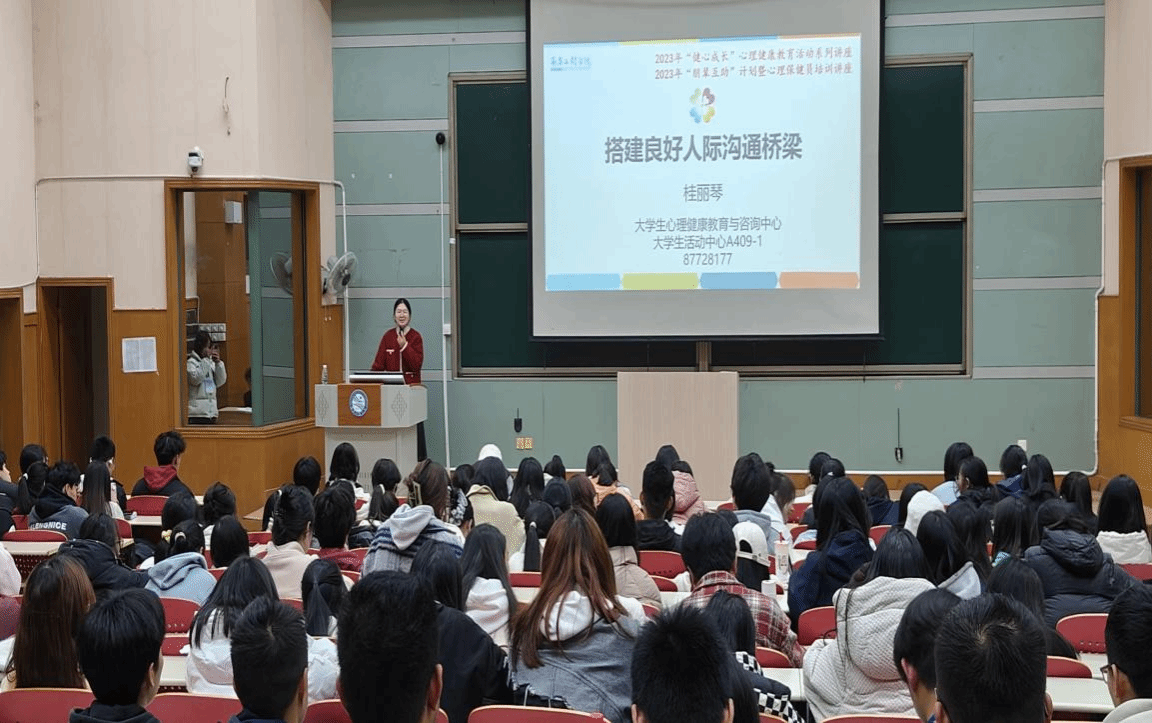 11月16日,我校大学生心理健康教育与咨询中心在北C104开展2023年“健心成长”心理健康教育活动之“搭建良好人际沟通桥梁”专题讲座,本次讲座由心理中心专职教师桂丽琴主讲。各学院心素部负责人、班级心理保健员及心理协会干事共200余人参与。